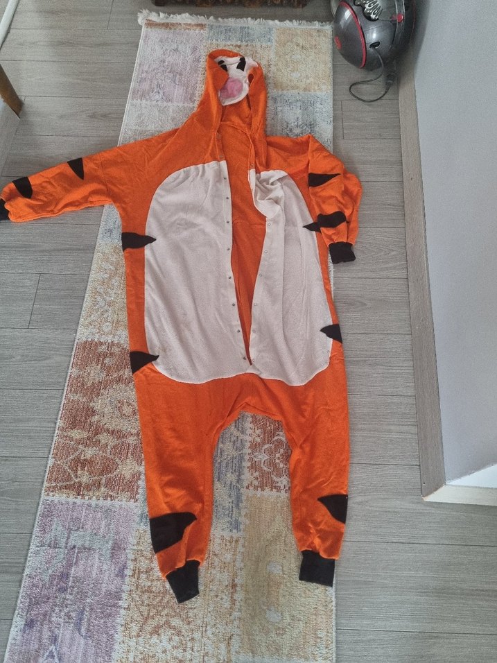 Renkli turuncu baskılı, düğmeli kaplan kostümü, streetwear tarzında tasarlanmıştır. Bir sorunu yok sadece biraz lekeli yıkanınca cıkabilir