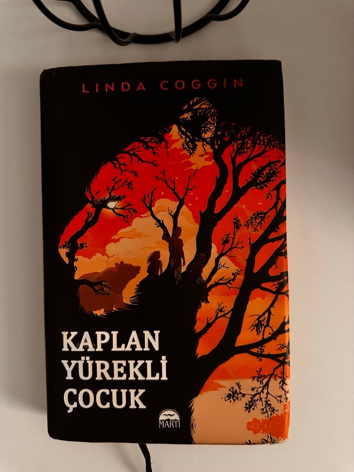 Linda Coggin'in Kaplan Yürekli Çocuk adlı romanı, alevli bir günbatımı önünde silüet halinde ağaç ve figürler içeriyor.