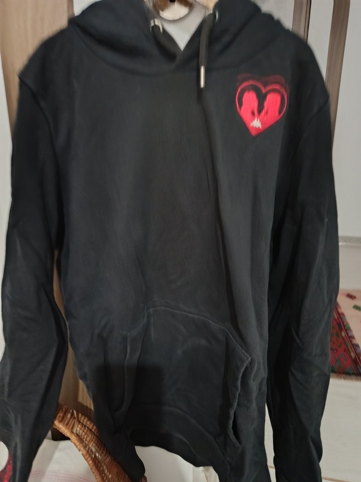 Siyah kapüşonlu, uzun kollu sweatshirt, kırmızı kalp baskılı ve fermuarlı detaylı. Rahat kesim ve normal uzunlukta, yumuşak ve sıcak kumaştan yapılmıştır. ❤️Kapşon kısmında hafif renk solması mevcut.Kullanıma engel değildir.Boy 59 en 48 cm.