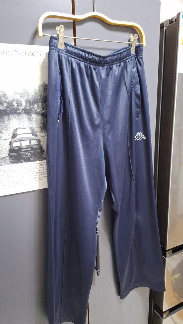 koyu mavi renkli, rahat kesim ve fermuarlı ceplere sahip, yumuşak ve sıcak kumaştan eşofman altı. Spor ve sokak tarzı için uygun.