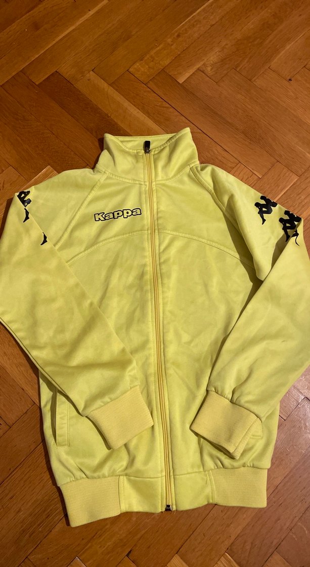 Sarı Kappa fermuarlı ceket, uzun kollu ve bisiklet yaka. Yumuşak ve sıcak kumaştan, ince kesim ve kollarda siyah spor logoları bulunur. Rahat kullanım için uygun. 164cm