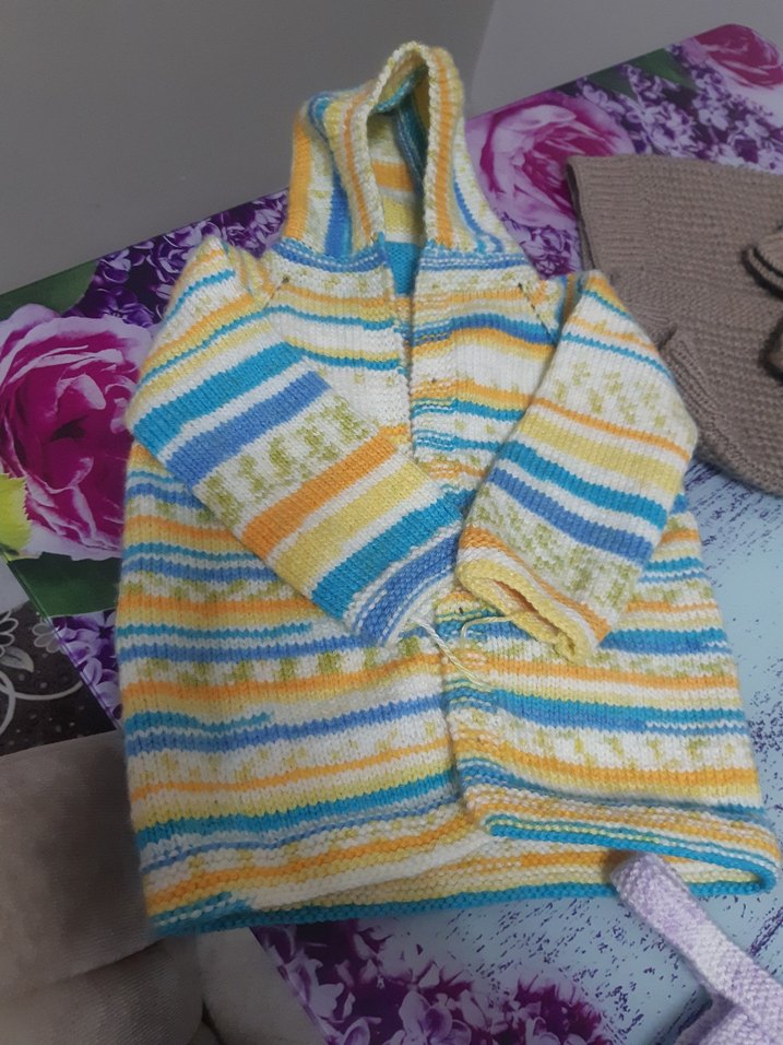 Erkek çocuklar için pastel çok renkli, yumuşak triko kumaştan örülmüş, kolsuz ve V yakalı süveter. Regular kesim ve bohem tarzda. kapşonlu ceketler