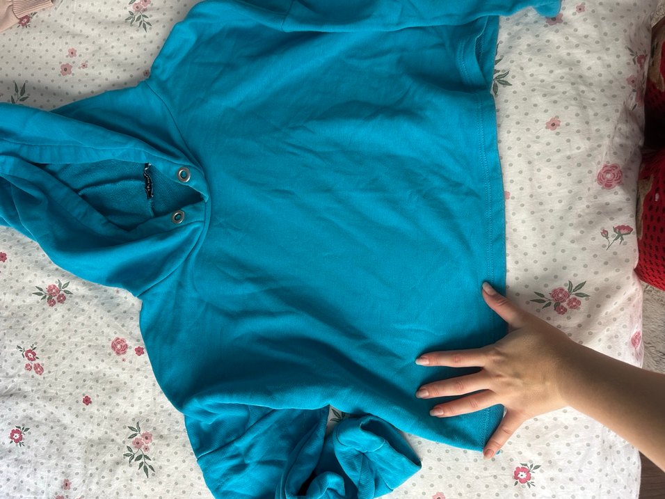 Düğmeli, yuvarlak yaka ve uzun kollu bol kesim hamile gömleği. Parlak mavi renkte, yumuşak keten kumaştan üretilmiştir. Günlük kullanım için uygundur.