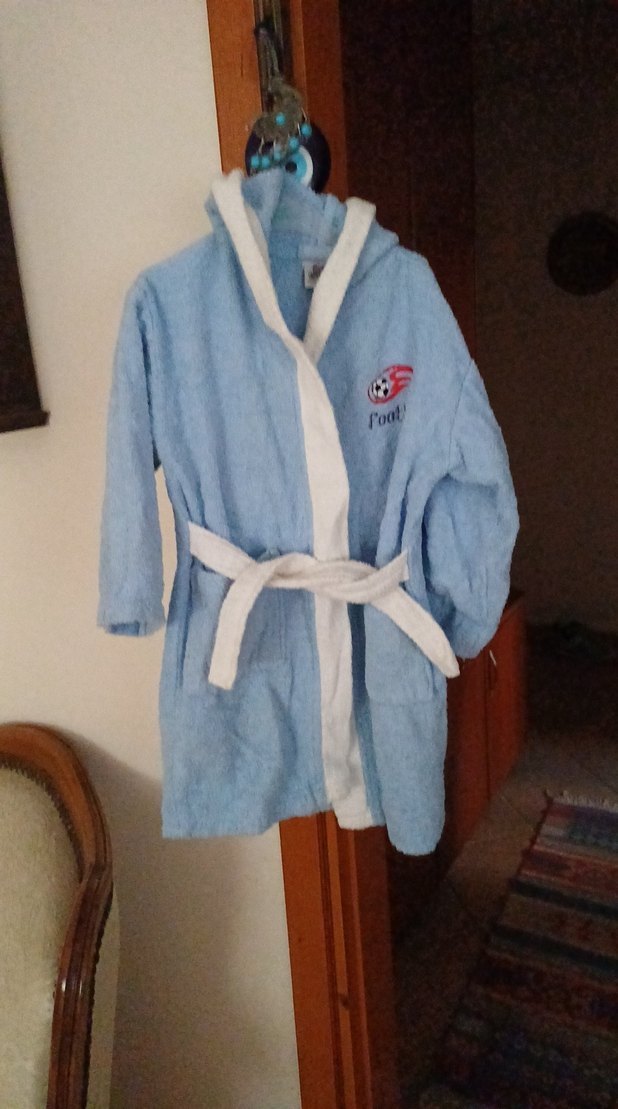 Kapşonlu, kemerli ve futbol desenli yumuşak mavi erkek çocuk bornozu. Banyodan sonra rahatlık sağlar. ⚽