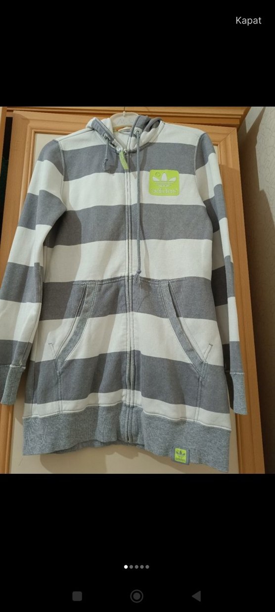 Gri çizgili, uzun kollu, fermuarlı kadın Hırka. Rahat kesimi ve yumuşak, sıcak kumaşıyla günlük kullanıma uygun. orijinal Adidas tır. birkaç defa giyildi. Bu ürün benim değil toplu alımda dikkate alarak almanızı tavsiye ederim çünkü sehirlerimiz farklı