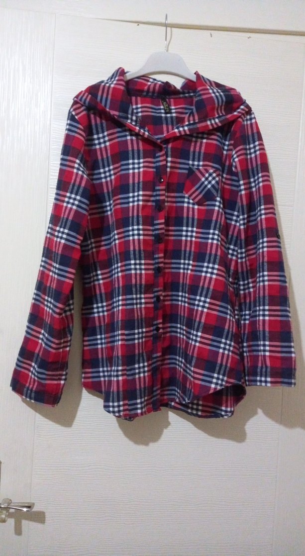 Kapşonlu, uzun kollu kırmızı kareli kadın gömleği. Yaka detaylı ve normal boyda, bol kesimdir. Sentetik kumaştan yapılmış, rahat ve günlük kullanıma uygundur.