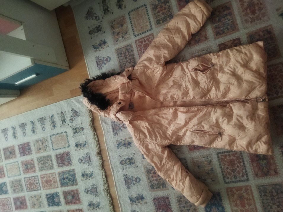Bej renkli, uzun kollu ve kapüşonlu, siyah kürk detaylı çocuk mont. Yumuşak sentetik kumaştan üretilmiştir içi pamuklu hiç bir yırtığı söküğü yok