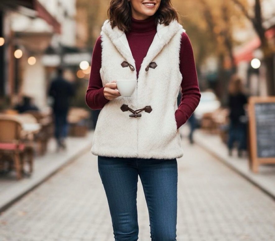 Kürk detaylı, Kolsuz, deri tokalı, yanlardan gizli cepli, kapşonlu, astarlı, tertemiz peluş yelek, sayılı giyildi. İki kol arası 40 cm, boy 60 cm.
