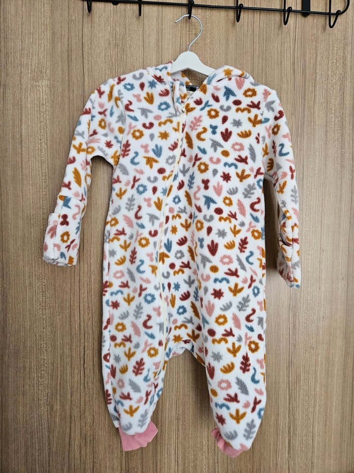 Renkli desenlere sahip, yumuşak örgü kumaştan yapılmış, uzun kollu ve ayaklı bebek kız tulumu.