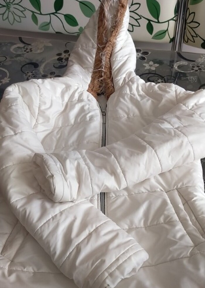 Kapşunu tüylü beyaz şişme mont 1 kez giyilmiş s beden