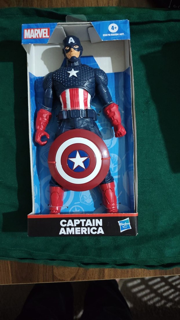 Kaptan Amerika aksiyon figürü koyu mavi ve kırmızı renklere, kalkan ve detaylı kostüme sahiptir. Kutu üzerinde "AMERICA, CAPTAIN" yazısı bulunur. ️