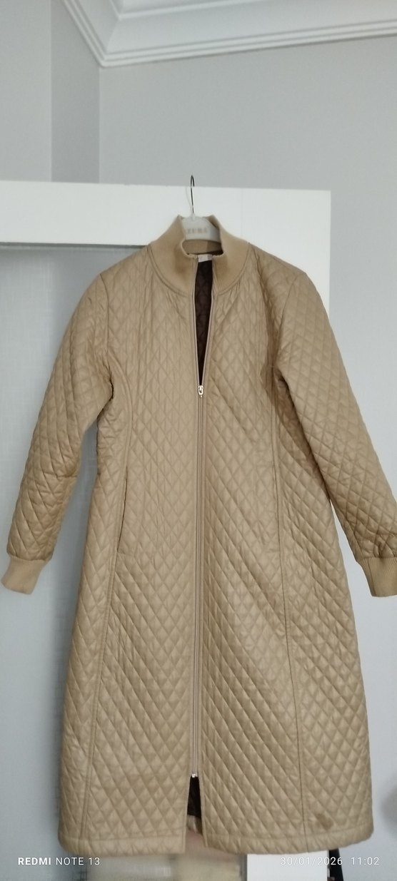 Bej renkli, fermuarlı uzun kadın mont. Kapitone desenli ve rahat kesimli, uzun kollu, notched yakalı, günlük rahat stil için uygundur.