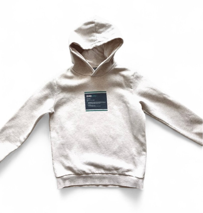 Çok bej renkli, kapüşonlu ve uzun kollu erkek çocuk sweatshirtü. Rahat kesimli, yumuşak bir ürün