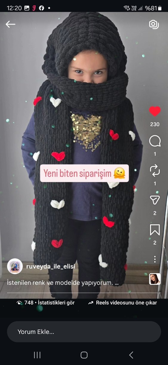 Siyah örgü kadın şal, küçük renkli kalp detaylarıyla rahat sokak stili sunar. El yapımı olup renk ve model isteğe göre yapılır