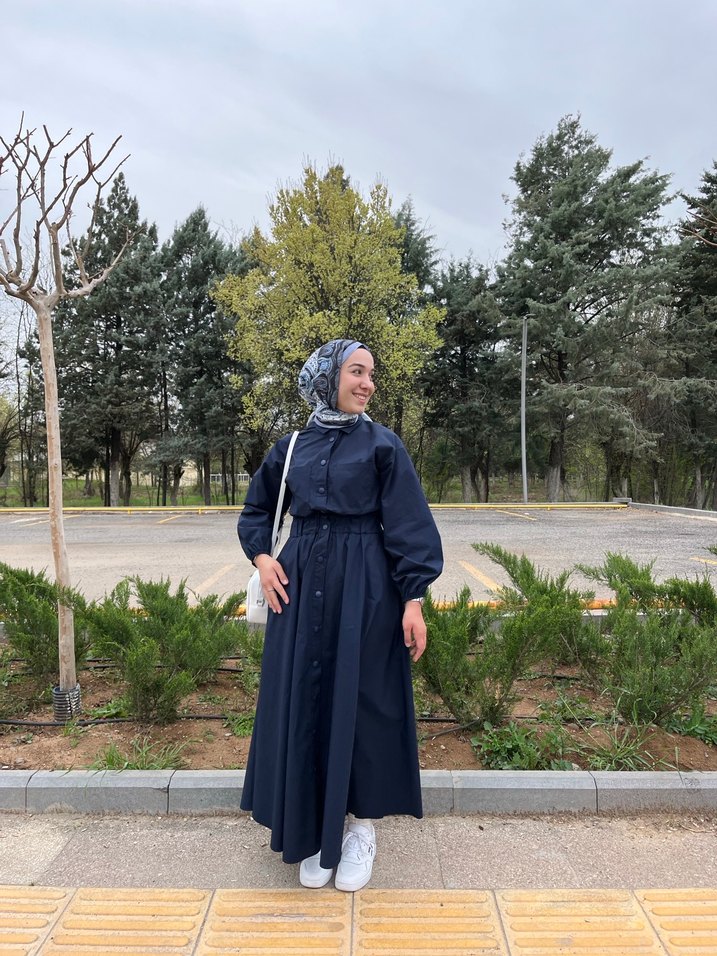 Lacivert uzun elbise, bol kesim ve drapeli detaylara sahip. Kapüşonlu yakası ve bağcıklı kol tasarımı ile sokak stiline uygun, hafif gri tonlarında batik desenlidir.