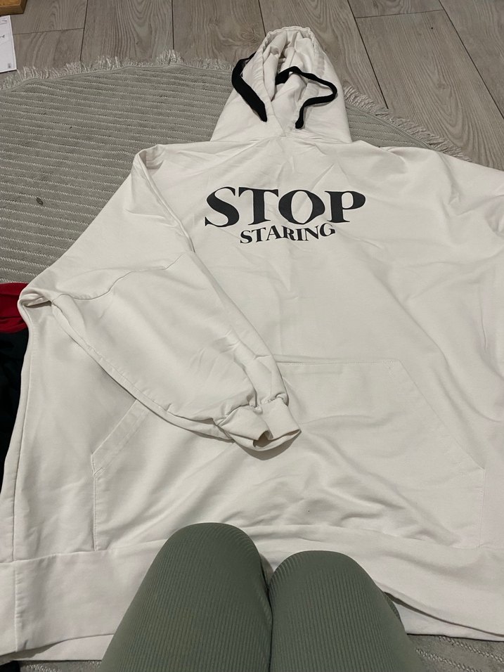 Bol kesim, uzun boylu beyaz kadın sweatshirtü kapüşonlu ve uzun kolludur. "STOP STARING" baskısı ve tokalı detayı vardır, sentetik kumaştan yapılmıştır.