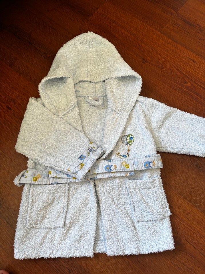 Yumuşak ve sıcak kumaştan kapüşonlu erkek çocuk bornozu, gri baskılı desenli ve kemerli. Ön cepleriyle kullanışlıdır. 6/9 ay arası