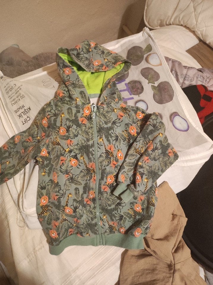 Yumuşak fleece kumaştan, kapüşonlu ve fermuarlı, bol kesim gri renkli baskılı erkek çocuk ceketi. hepsinin fiyatidir
