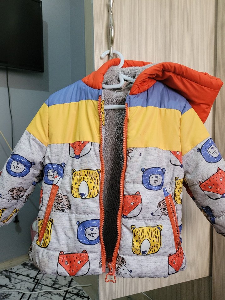 Kapüşonlu ve fermuarlı, bol kesim erkek çocuk montudur. Yumuşak ve sıcak kumaştan yapılmış, gri zemin üzerinde mavi, sarı ve kırmızı renklerde hayvan yüzleri baskılıdır.