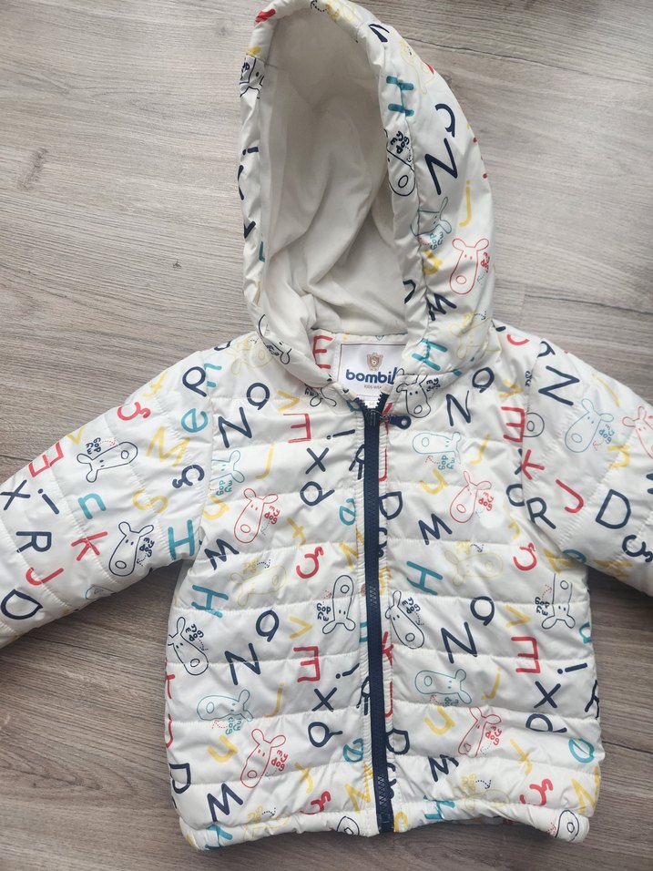 Renkli harfler ve küçük ayı desenleriyle kapüşonlu, fermuarlı, yumuşak ve sıcak kumaştan yapılmış erkek çocuk montu.