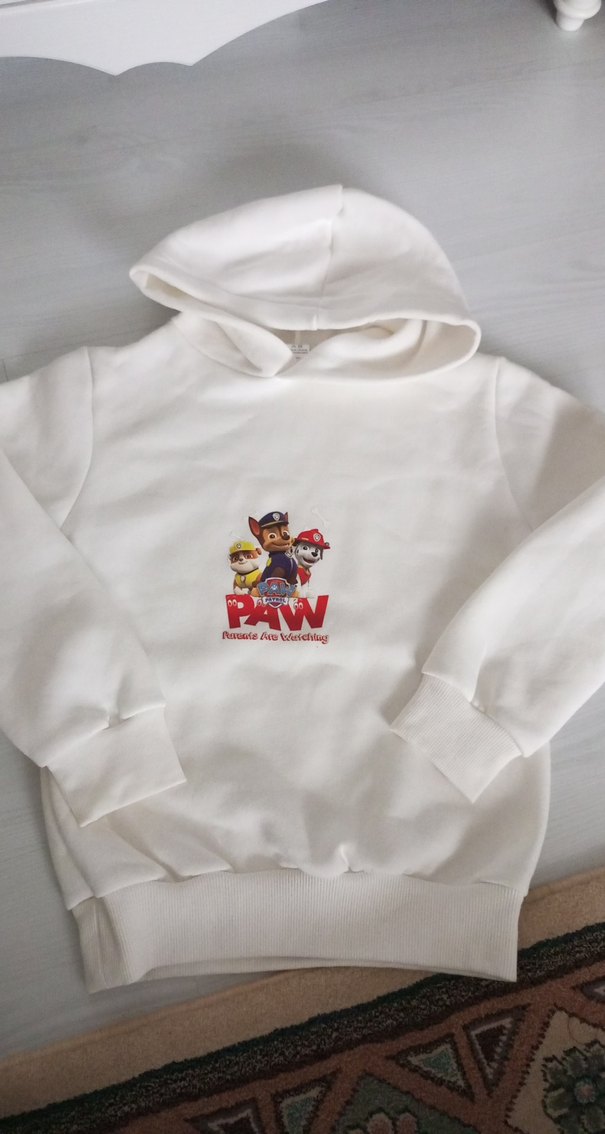 özel dikim sıfır ürün 5/6 yaş boy 50 cm en 38 cm Kapüşonlu, uzun kollu beyaz erkek çocuk sweatshirtü, önünde renkli baskılı karakterler bulunur. Yumuşak ve sıcak kumaştan, üç iplik şardonlu rahat kesimlidir.