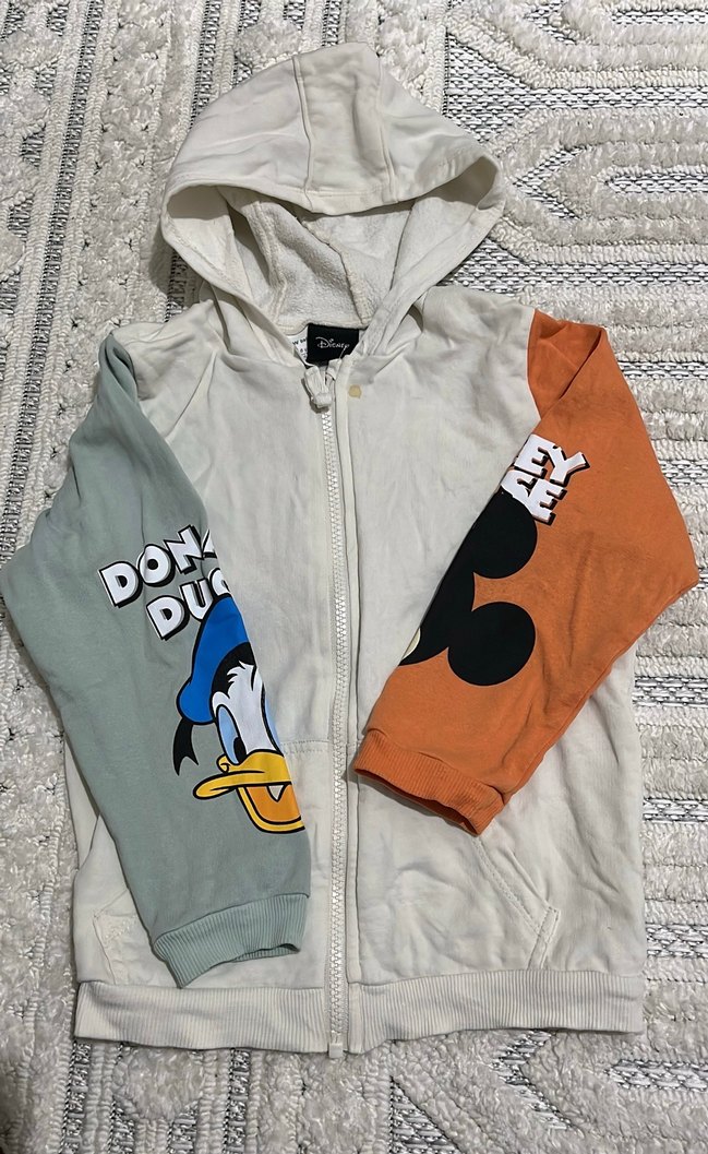 Kapüşonlu ve uzun kollu, bol kesim erkek çocuk sweatshirt. Önü fermuarlı, renkli kollarında Donald Duck ve Mickey Mouse baskıları bulunur. Yumuşak ve sıcak kumaştan üretilmiştir.