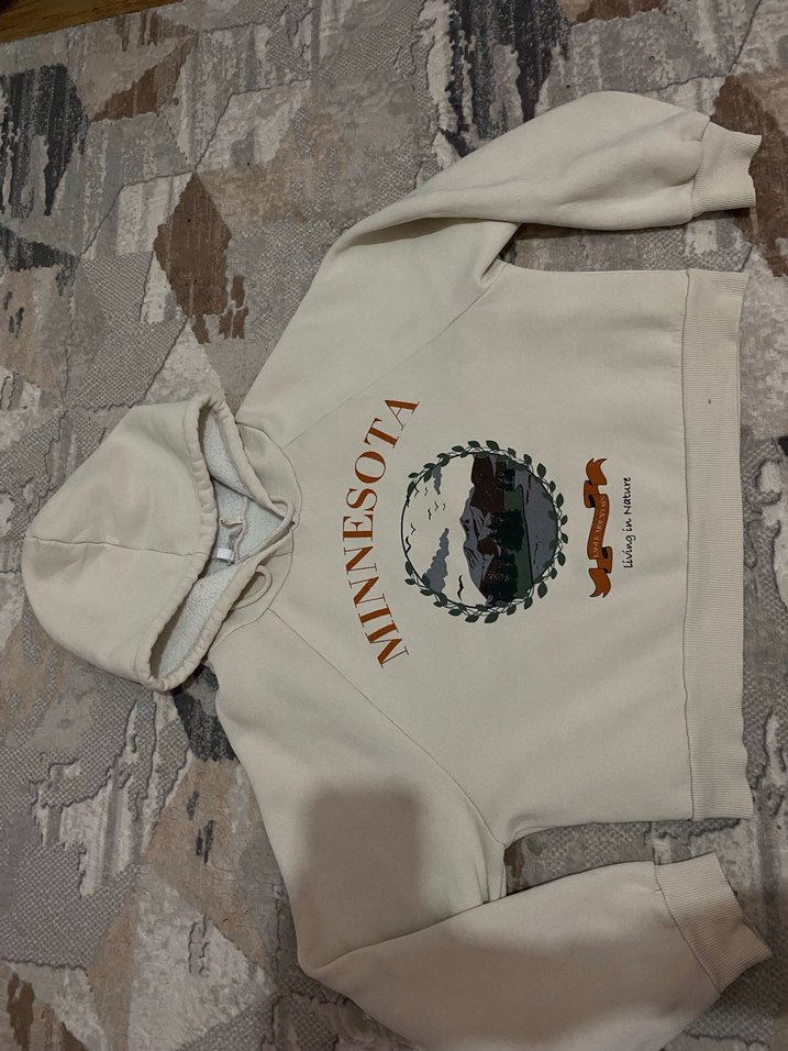 Yumuşak, sıcak kumaştan yapılmış, kapüşonlu ve fermuarlı, baskılı Minnesota desenli bol kesim kadın sweatshirt. Dış mekan kullanımı için uygundur.