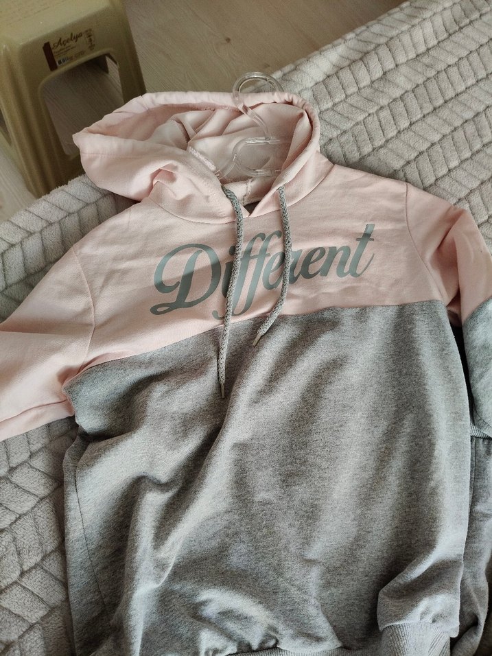 Kadınlar için kapüşonlu, baskılı sweatshirt. Uzun kollu, pembe ve gri renklerle
