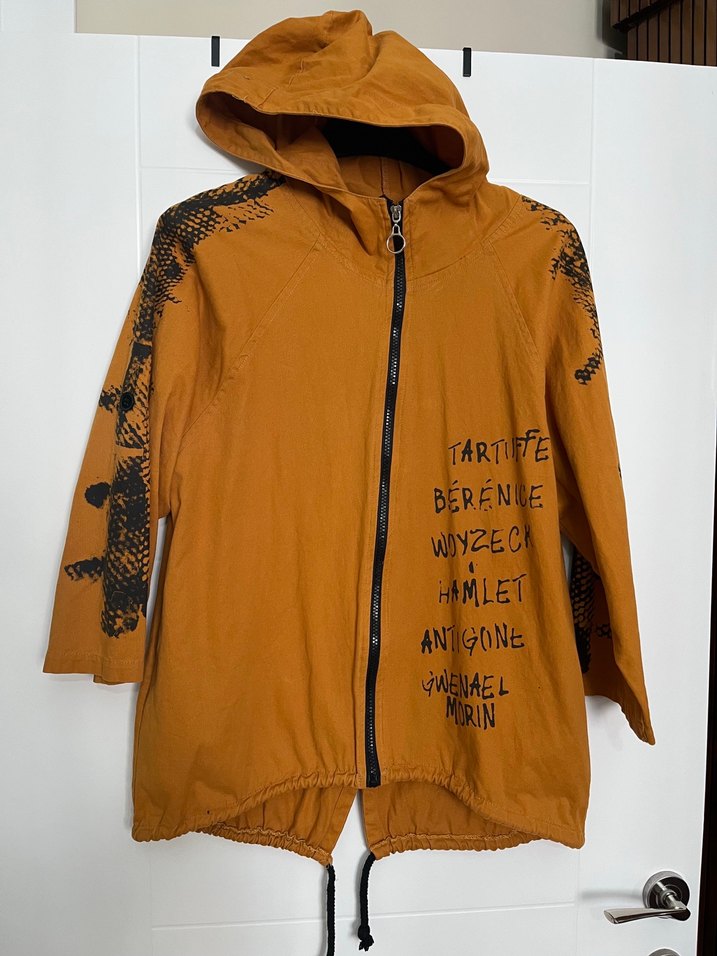 Kapüşonlu, fermuarlı ve baskılı desenlere sahip kahverengi yağmurluk, bol kesim ve tekstil materyalden üretilmiştir.