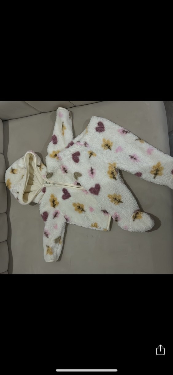 Kapüşonlu, kürklü ve baskılı yumuşak dokulu beyaz bebek tulumu, sıcaklık ve konfor sağlar. ❄️ Temizdir göründüğü gibi defosu yok. 3-6 ay aralığında çok rahat.