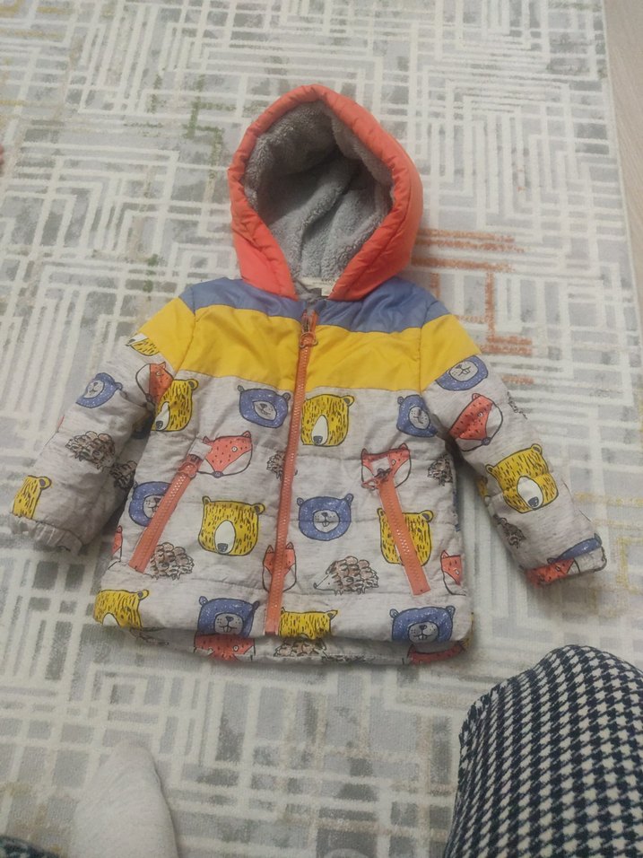 Kapüşonlu, baskılı, kürklü gri çocuk mont