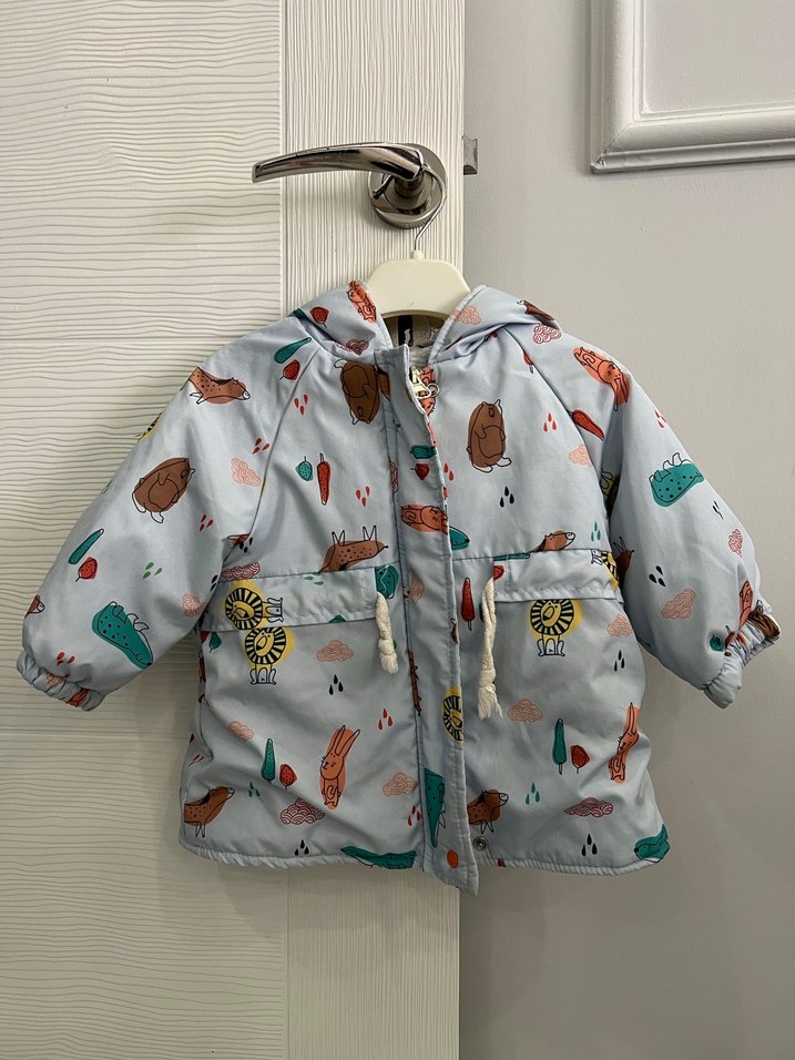 Kapüşonlu ve düğmeli, yumuşak ve sıcak kumaştan yapılmış, bol kesim mavi baskılı erkek çocuk mont.