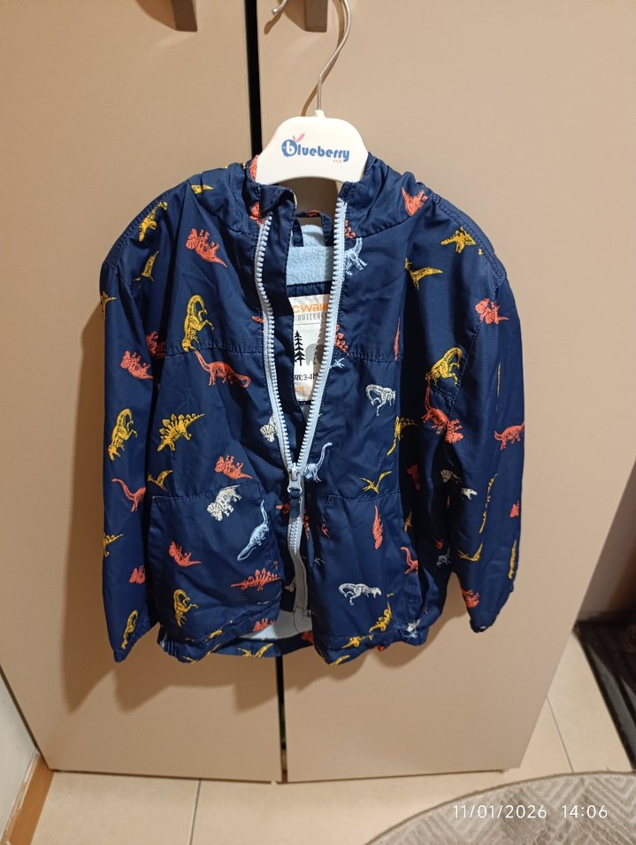 Kapüşonlu, fermuarlı ve renkli dinozor baskılı koyu mavi erkek çocuk yağmurluğu. Yumuşak kumaştan, rahat ve bol kesim sokak stili. "Ctveberry" markalı.