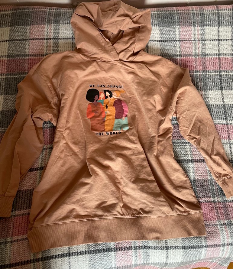 Kapüşonlu, uzun kollu, baskılı ve rahat kesim kahverengi sweatshirt. Yumuşak tekstil malzemeden, günlük rahat kullanıma uygun, pastel tonlarda.