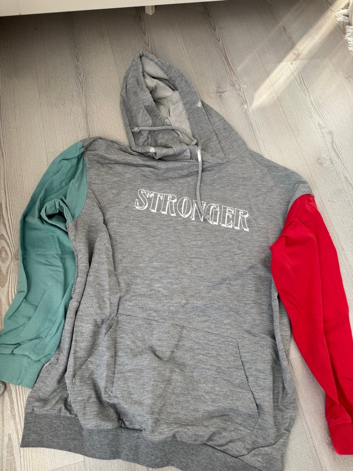 Kapüşonlu, farklı renk kollu gri sweatshirt, "STRONGER" baskılı, fermuarlı, rahat kesim ve sokak stiliyle spor görünüm sunar. ♀️