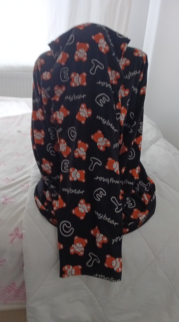 Kapüşonlu ve uzun kollu, siyah zemin üzerine baskılı ayıcık desenli, yumuşak kumaştan yapılmış dar kesim hamile pijama takımı.
