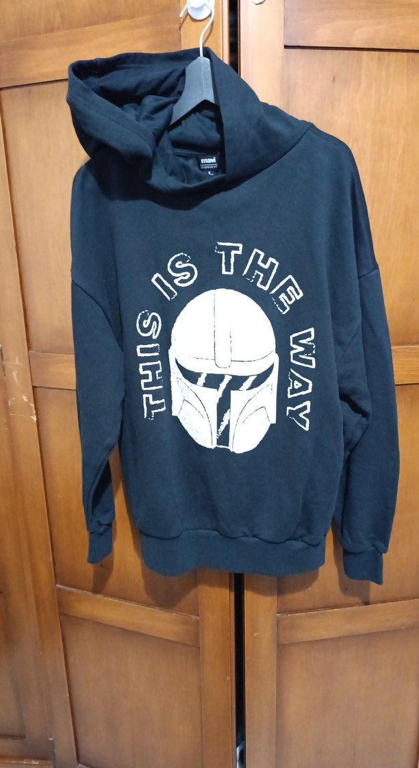 i siyah kapüşonlu, uzun kollu ve bol kesim sweatshirt. Baskılı tasarım ve yumuşak ve sıcak kumaştan üretilmiştir.