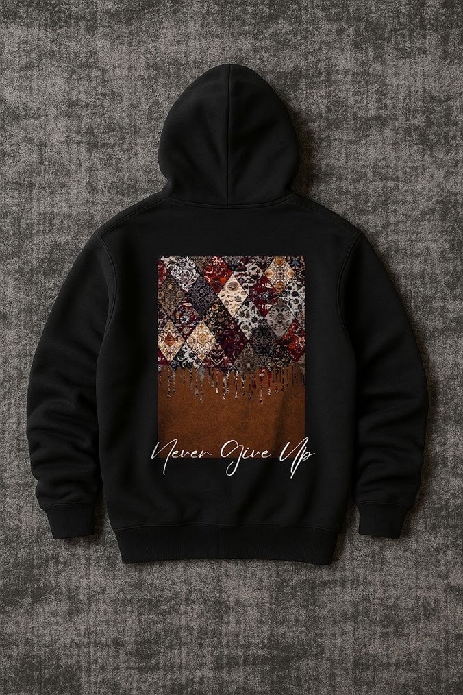 3 iplik şardonlu kompakt penye-regular kalıp Koyu kahverengi kapüşonlu sweatshirt, baskılı desen ve "Never Give Up" yazısı içerir. Uzun kollu, bol kesim ve yumuşak, sıcak kumaştan üretilmiştir. S/M/L/XL/XXL