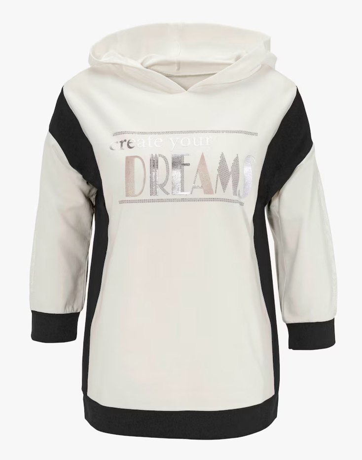 Kapüşonlu, uzun kollu, bol kesim kız sweatshirtü. "DREAMS" baskılı, beyaz ve gri tonlarda, yumuşak ve sıcak kumaştan yapılmıştır. Poşetinde açılmamış giyilmemiş orjinal kapşonlu sweat. S beden % 100 pamuklu. Göğüs ölçüsü 52 cm boy 64 cm.Kartı stickırı mevcut. Önünde parlak baskı var , taşlar var ve varak gümüş baskı var.