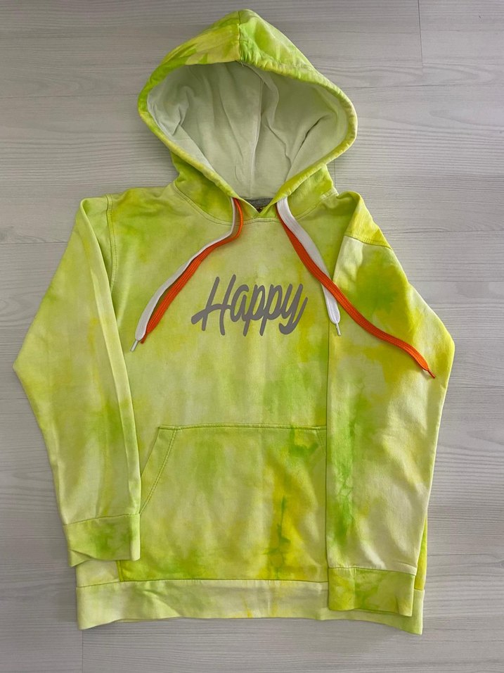 renkli batik desenli sweatshirt, kapüşonlu ve uzun kolludur. Yumuşak fleece kumaştan, bol kesim ve 'Happy' baskılıdır. Rahat sokak stili için uygundur.