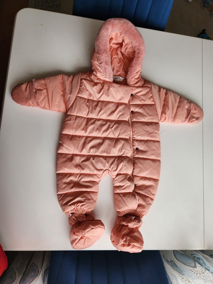 Pastel pembe somon renkli, kapüşonlu ve kürklü detaylı bebek tulumu. Düz deseni ve baştan ayaklara kadar koruması ile sıcak tutar. ❄️
