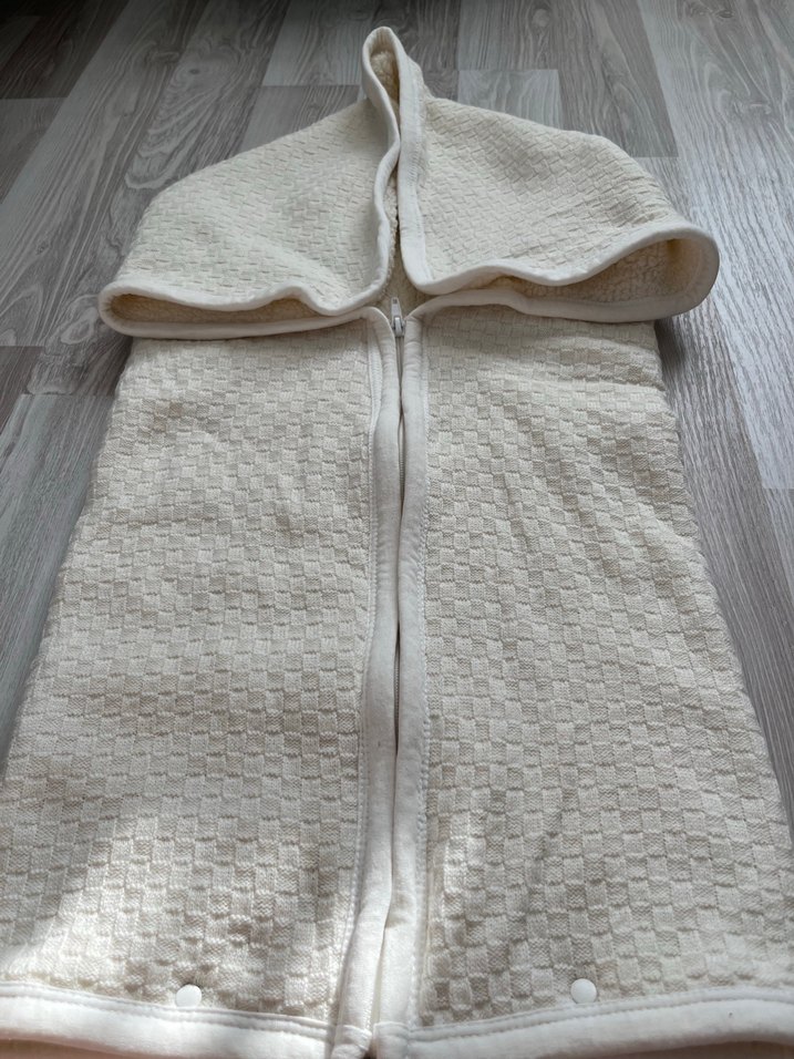 Yumuşak ve sıcak kapüşonlu bebek battaniyesi, beyaz renkte, ön fermuar ve çıtçıtlarla kolay kullanım sağlar.