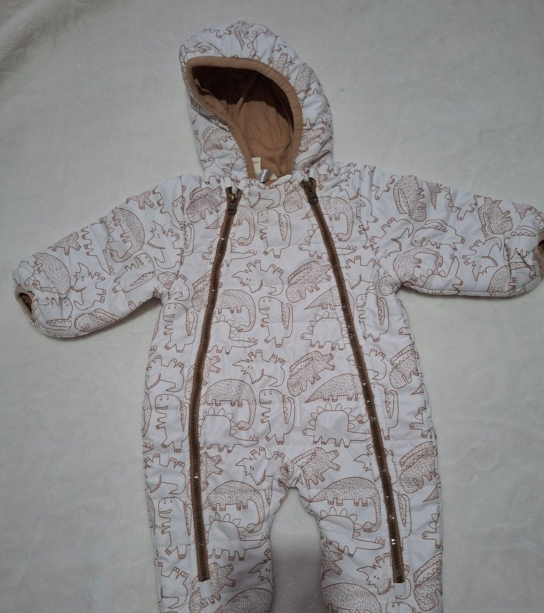 taba ve beyaz renklerde, yumuşak fleece kumaştan yapılmış kapüşonlu bebek kış tulumu. İki ön fermuarlı ve yılan desenli, yağmur geçirmez. 3 - 6 ay arası giyilebilir.