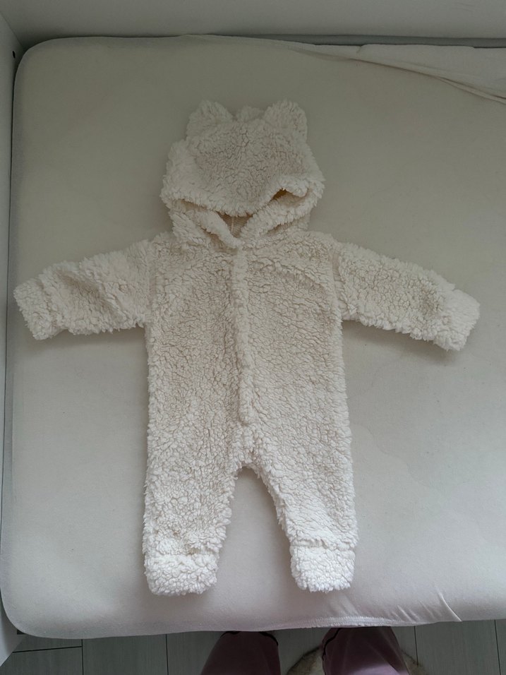 Kapüşonlu, peluş detaylı, beyaz renkli, desensiz bebek tulum . 3 ay peluş tulum