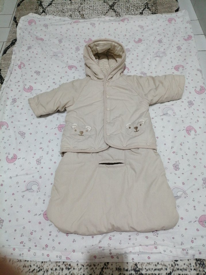 Kapüşonlu ve düğmeli bej renkli, düz pastel tonlarda yumuşak kumaştan yapılmış bebek tulumu. Çok kullanışlı ister mont ister dışarıda uyku tulumu olarak kulanabirsiniz 2 parçadır ayak kısmı kapalıdır. Soguk geçirmez.
