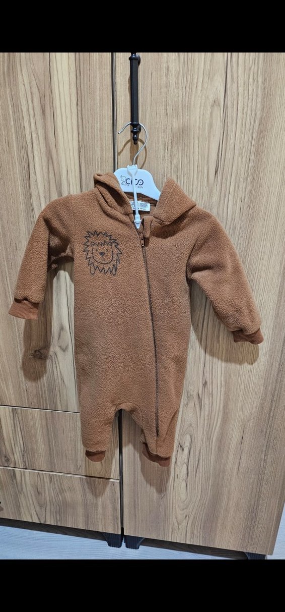 Koyu kahverengi erkek bebek tulumu, yumuşak ve sıcak kumaş, baskılı aslan detayı ve kürklü kapüşon ile sokak giyimi tarzında.