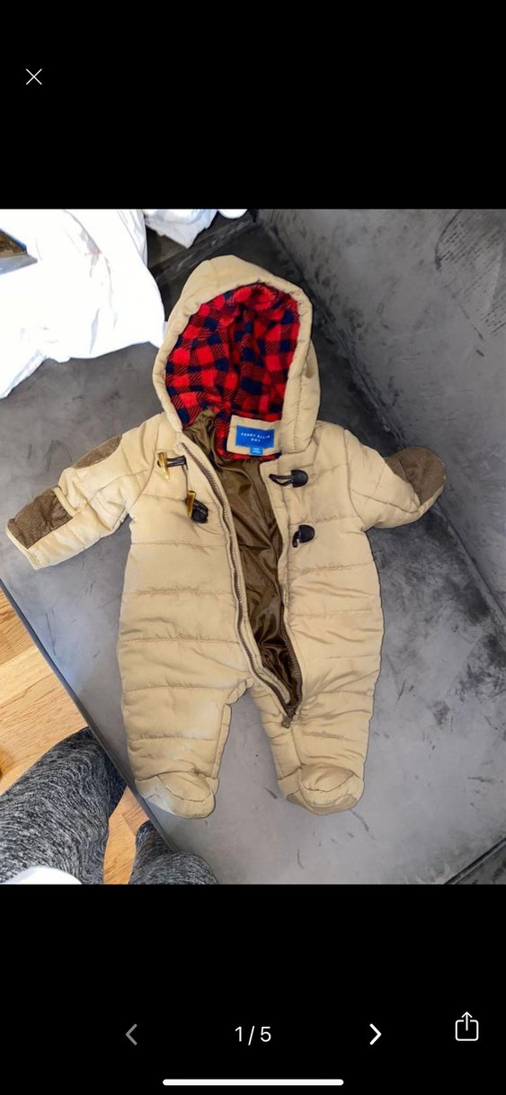 Açık kahverengi, kürklü kapüşonlu bebek tulumu. Yumuşak ve sıcak kumaş, kırmızı kareli iç astar. Sokak stili için uygun. ❄️