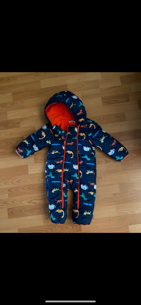 Kapüşonlu, fermuarlı bebek tulumu, yumuşak ve sıcak kumaştan yapılmıştır. Çok renkli dinozor desenleriyle koyu zemin üzerinde dikkat çeker.