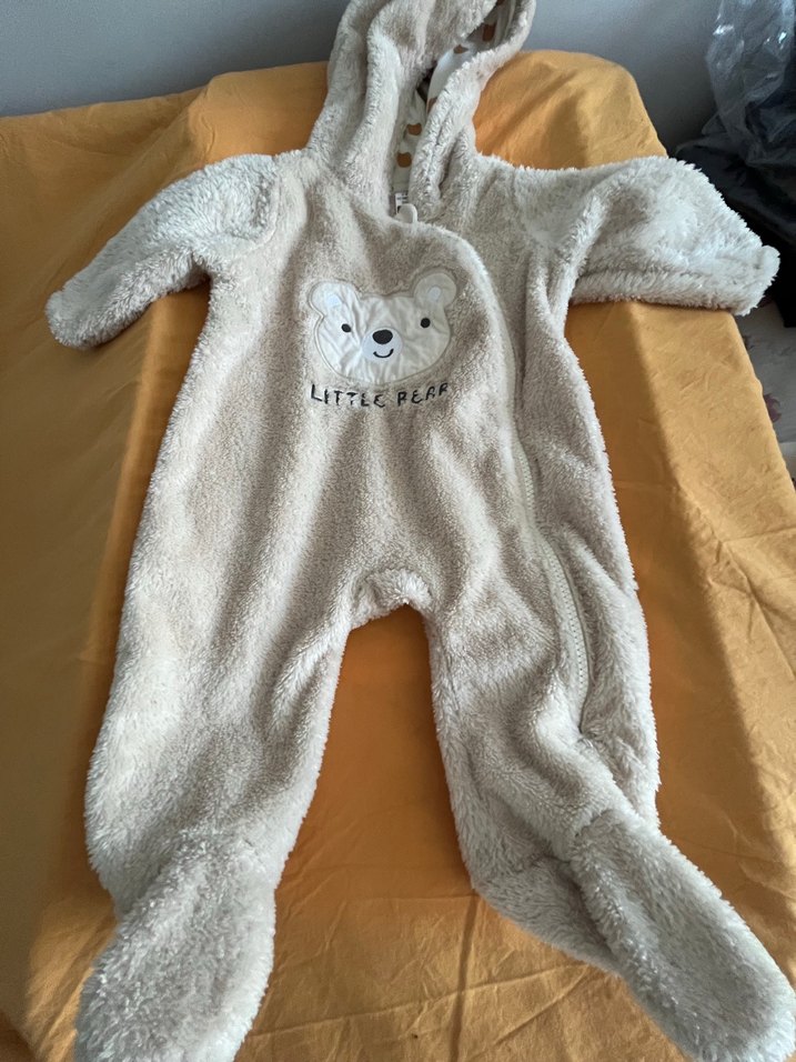 Yeni temiz Kapüşonlu, kürklü ve önünde ayı baskısı olan bej renkli bebek tulumu. Soğuk havalar için yumuşak ve sıcak tutar.