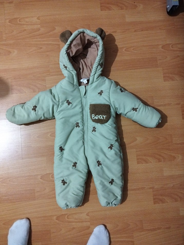 TEKLİF GÖNDERMEYİN LÜTFEN!Çağla yeşili. kapüşonlu ve ayı kulaklı bebek montu.Fermuarlı ön kısmı ve küçük ayı desenleriyle yumuşak, sıcak kumaştan üretilmiştir. Takıp çıkabilen pandufları var. Kolları kendinden eldivenli.